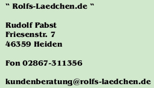Die für die Geschäftsabwicklung notwendigen Daten werden von uns auf EDV gespeichert und im Rahmen der Bestellabwicklung von der Firma Rolfs-Laedchen verwendet. Personenbezogene Daten des Kunden werden nur im Rahmen der gesetzlichen Vorschriften des Bundesdatenschutzgesetzes (BDSG) sowie des Teledienstdatenschutzgesetzes (TDDSG) erhoben. Bitte teilen Sie uns Anschriftsänderungen mit, damit wir zum Zwecke der übersendung weiterer Informationen und der sachgemäßen Abwicklung der Aufträge Ihre Anschrift verwenden können. Eine Weitergabe an Dritte, außer an Schuldnerverzeichnisse und Strafverfolgungsbehörden, erfolgt nicht.